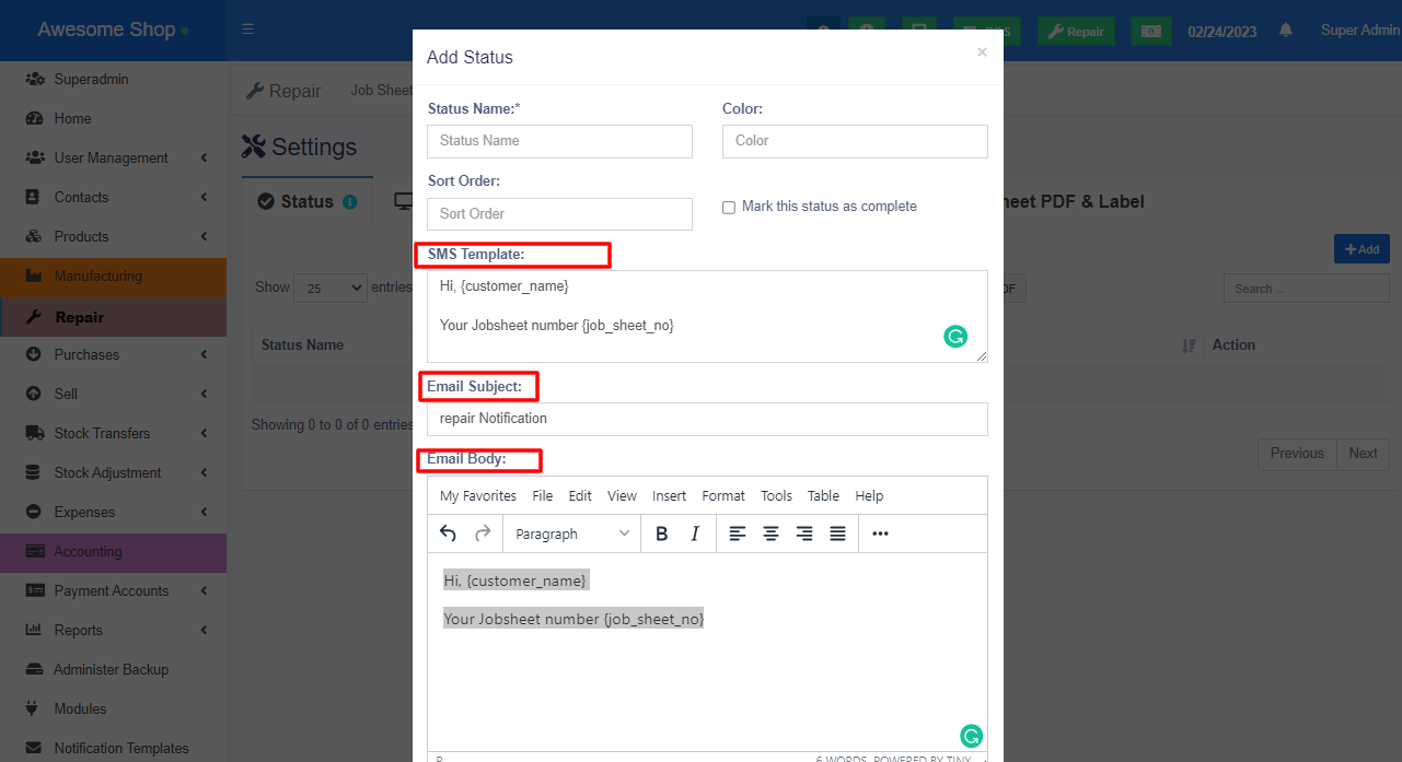 • 1. Status can be added/edited from Repair -> Settings -> Status