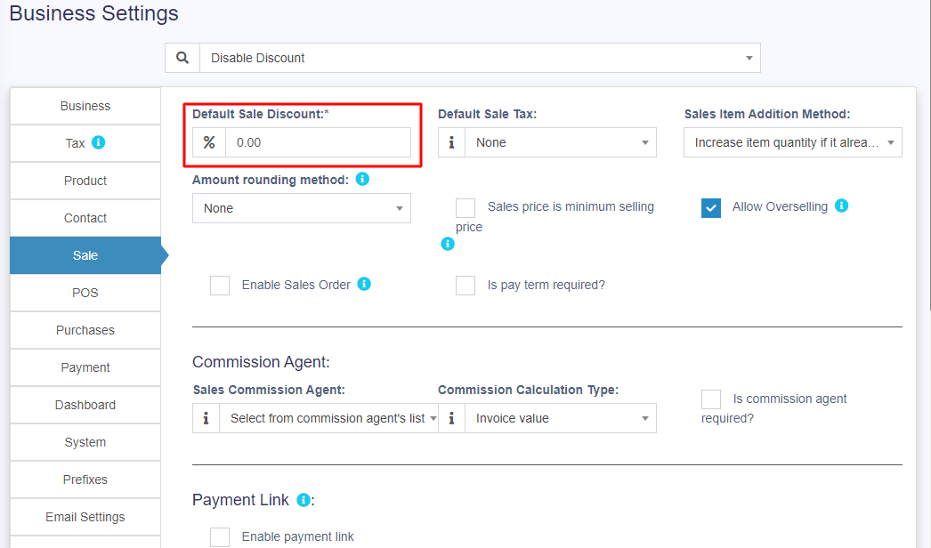 • Business Setting > Sale > Default Sale Discount: The default discount will be used for all sales in POS & Add sales screen.