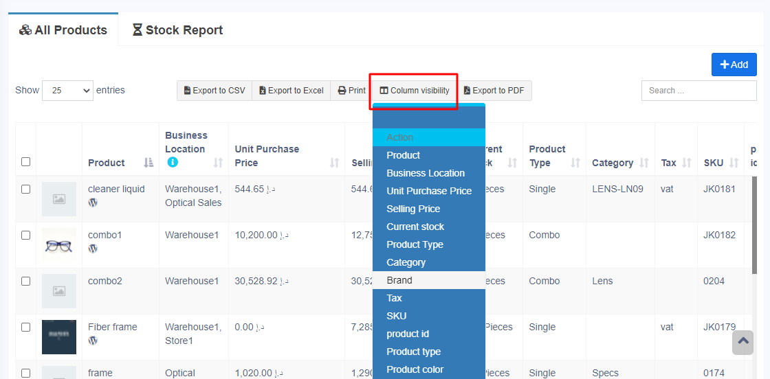 If you want to remove the action column or any other column while exporting the data, use the column visibility feature. Select the columns that are to be removed and then click export.