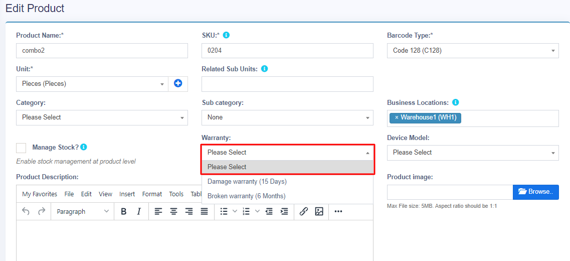 2. Assigining warranty for products: Go to Add/Edit product and select the warranty that is applicable for the product.