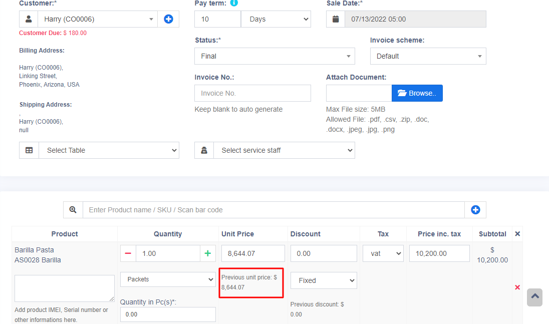 • After the products get added, click on the product name to modify product price, tax & discounts.