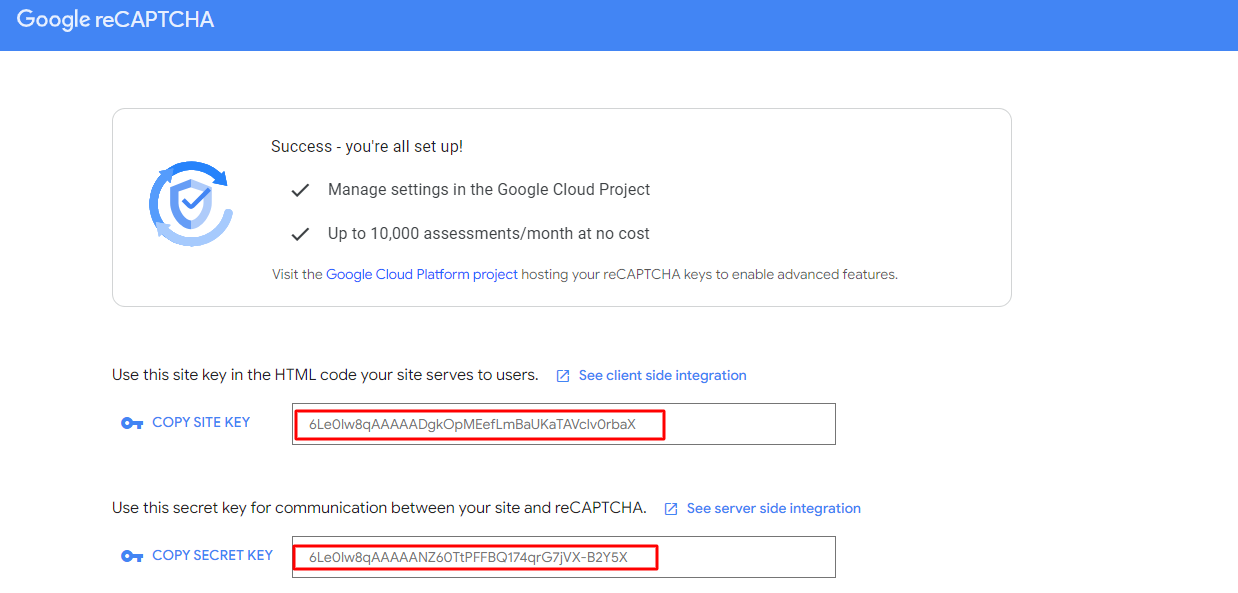 • Step 7: The site key and secret key will be generated. Copy these keys and use them in your application.