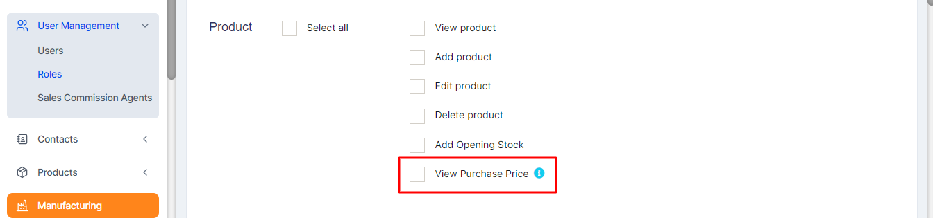 Step 3: Under the Product Section, you can disable the ‘View Purchase Price’ checkbox. If this is disabled, the user with the particular role can’t see the price while transferring.