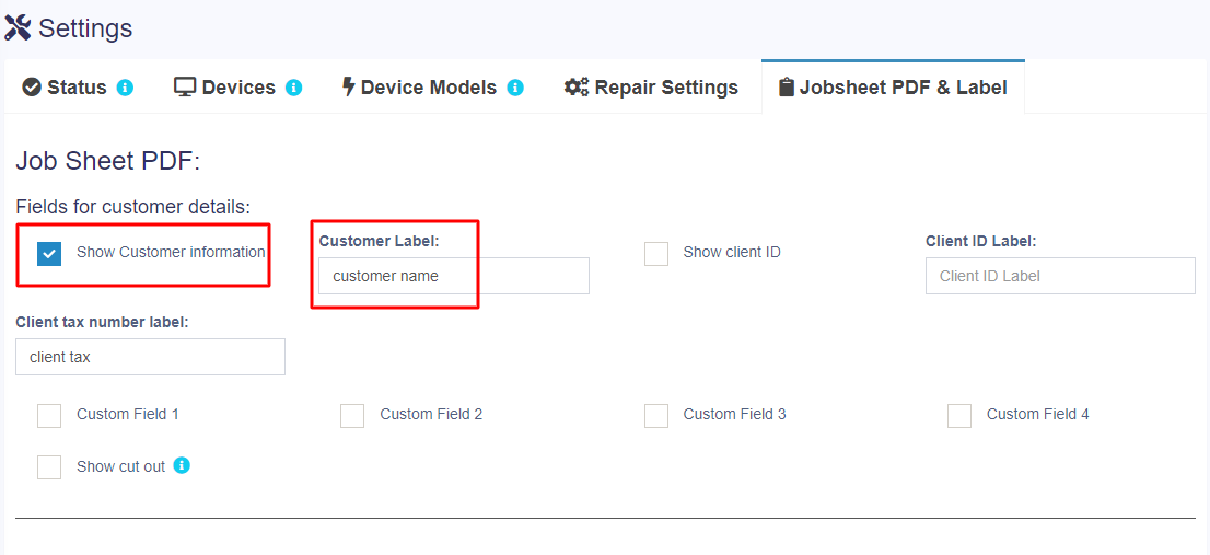 To display customer details in the job sheet, you need to enable it in Job Sheet > Settings > Jobsheet PDF & Label.