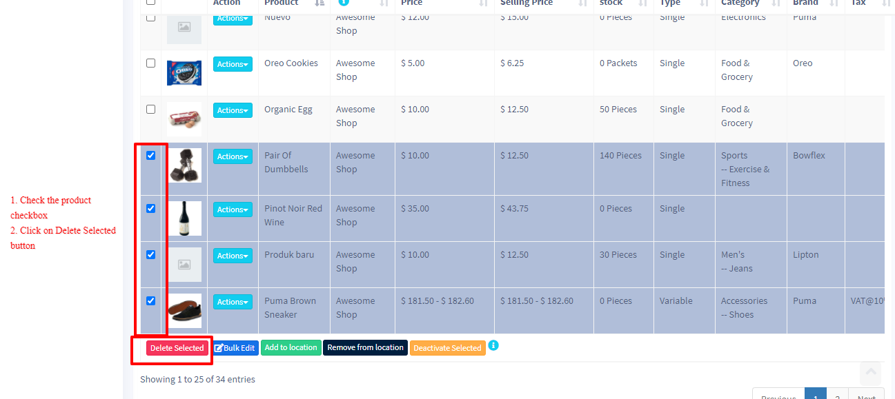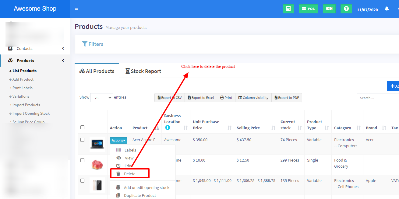 NOTE: This delete will not work if the product have some transactions related to it. Transaction can be Opening Stock, Purchase, Sales or Stock transfer of the product. It will show some error like: