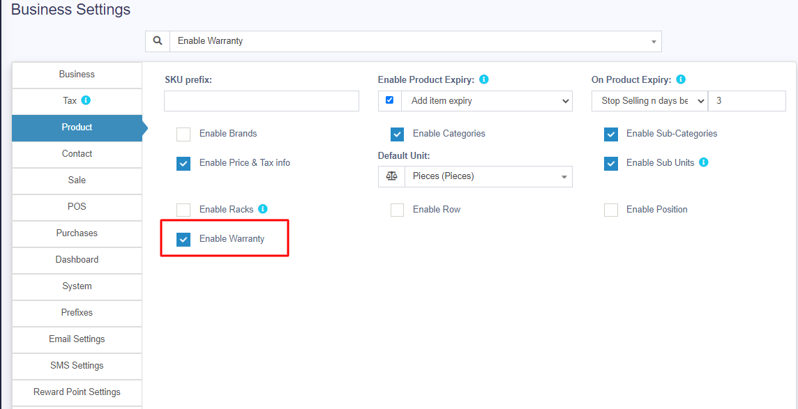 To enable warrany in products go to Settings -> Business Settings -> Products -> Enable Warranty