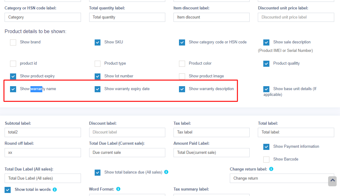 3. Sell with warranty: Any products which has warranty assigned when sold will use the transaction date as start of warranty. You can display warranty in receipts by enabling it from Invoice layout.