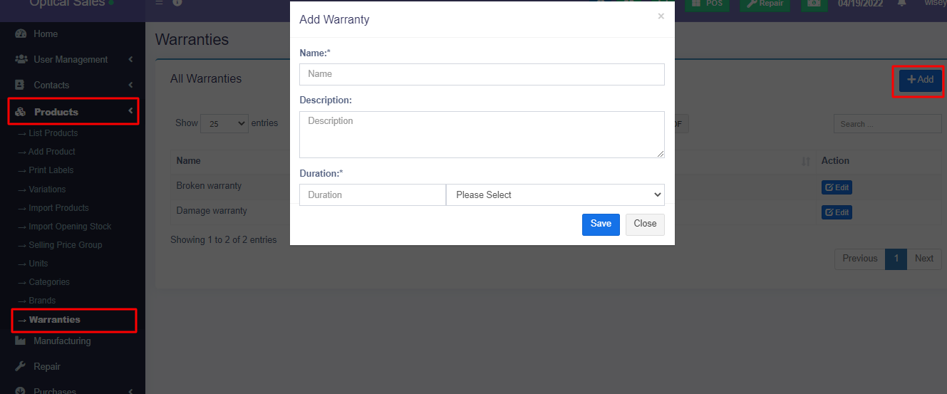 1. Adding Warranty: Add warranty types by going to Products -> Warranty.