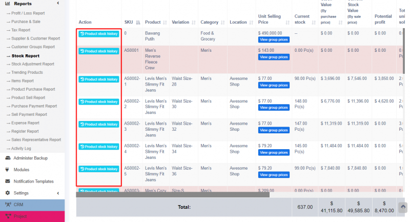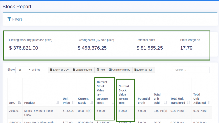 In the stock report, you can also get information about the current stock value based on their purchase price & value based on selling price. Check the below screenshot of stock report.