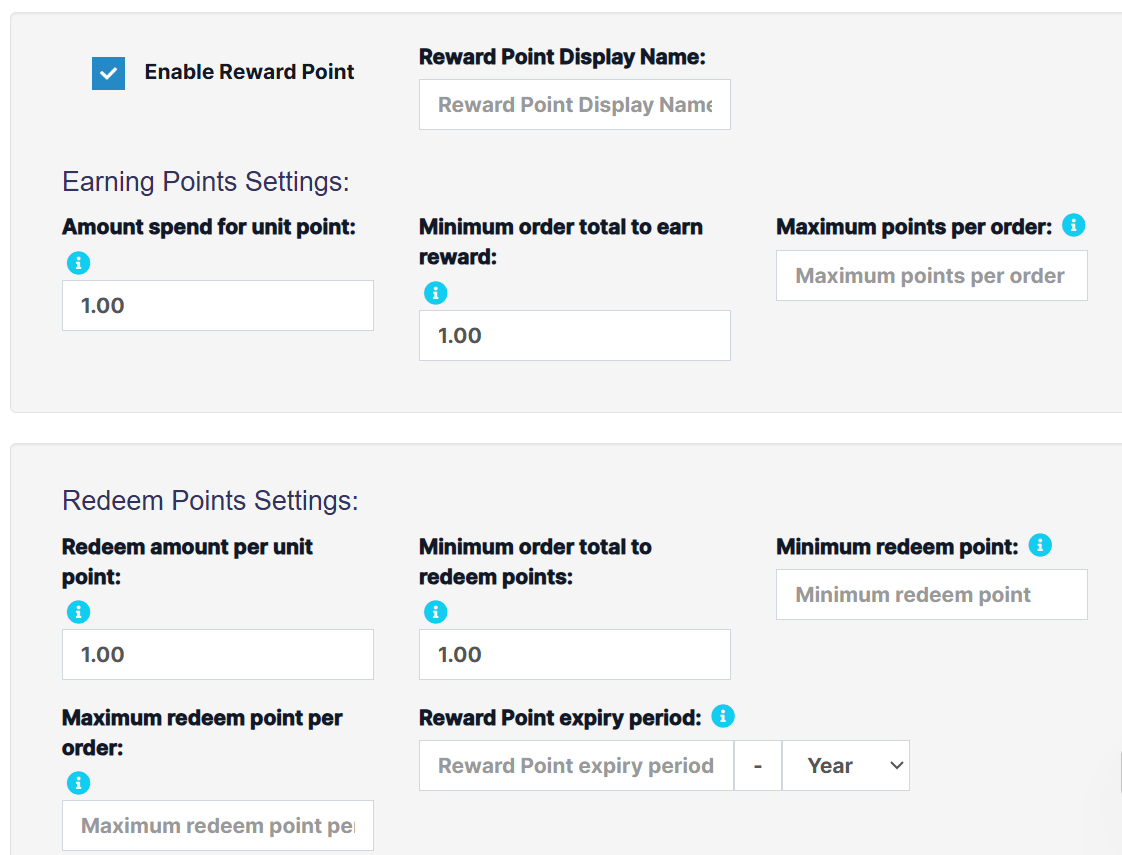 • Redeem point expiry period: Expiry period for points earned by customers. You can set it in months or years. Expired points will get deducted from the customer account automatically after this period.