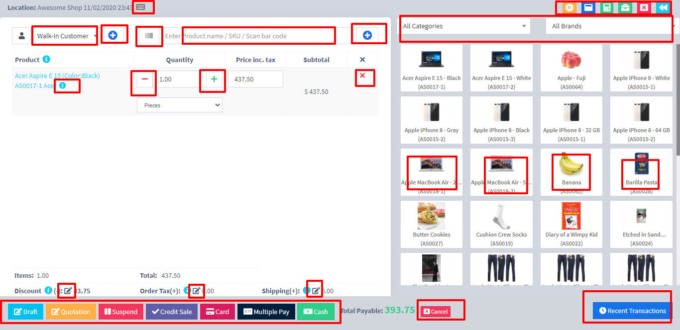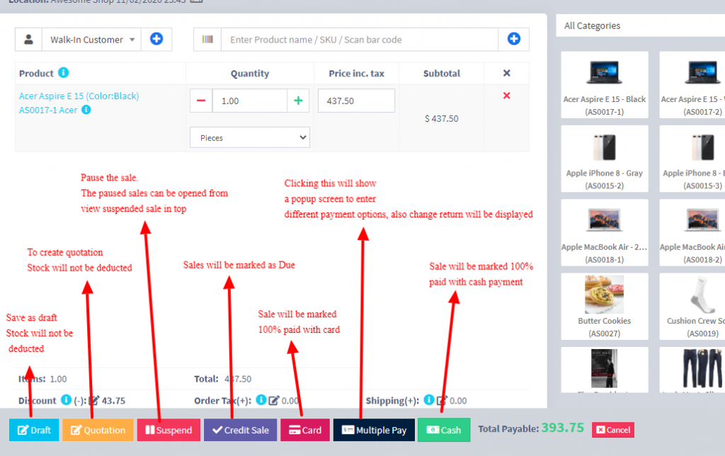 Selling (POS Screen), Credit Sales, Draft, Quotations & Suspended Sales