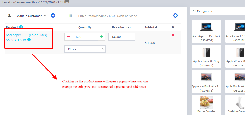 • After the products get added, click on the product name to modify product price, tax & discounts.