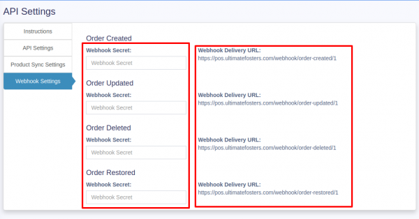 • 1. Go to WooCommerce -> API settings -> WebHook settings, there you will find Order Created, Order Updated, Order Deleted, Order restored webhook settings containing Webhook Secret & Webhook Delivery URL